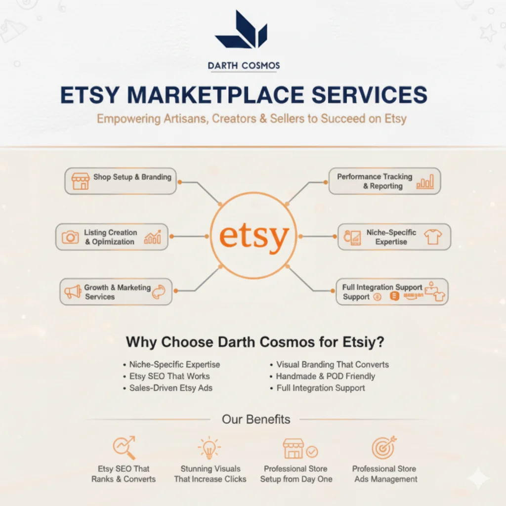 At Darth Cosmos, we help creative entrepreneurs and product-based brands launch, manage, and scale their Etsy shops with professionalism and polish. From handcrafted goods to digital downloads and print-on-demand, we position your brand to stand out in one of the most unique marketplaces in the world.