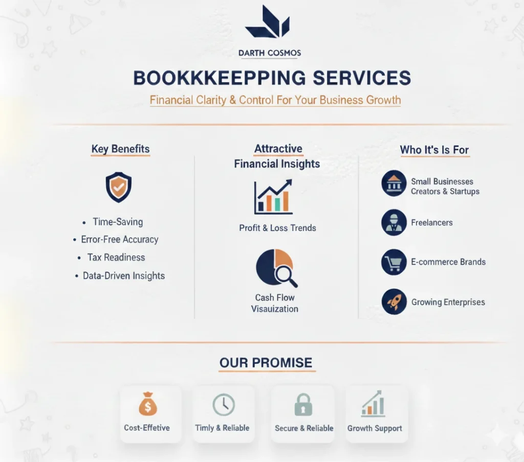 Let Darth Cosmos keep your books clean, updated, and tax-ready. Our bookkeeping service gives you clarity over your cash flow and keeps your business compliant and investor-ready.