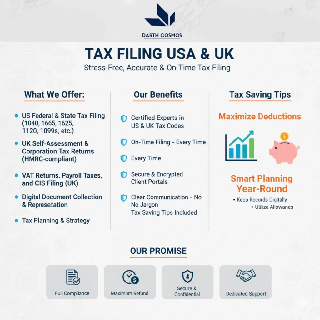 Ditch the paperwork headaches. At Darth Cosmos, we handle your tax filings in both the USA and UK with full compliance, maximum accuracy, and zero hassleโso you can focus on growing your business.