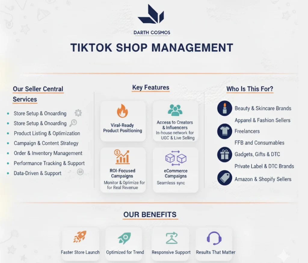 Darth Cosmos helps you unlock the full potential of TikTok Shop by managing every aspect of your Seller Central accountโso you can focus on growing your brand while we handle the backend, listings, marketing, and performance tracking.